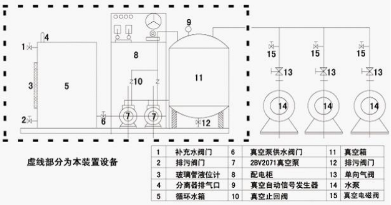 ZKYS真空引水裝置由兩臺2BV7111水環(huán)真空泵,一個真空罐,一個循環(huán)供水罐,一組管道閥件及一套電氣自動控制配電箱組成的成套的真空機組,是以真空罐作為真空存儲設備的成套系統(tǒng)。泵站內所有水泵頂部排氣口均安裝一個單向氣閥(不在本裝置范圍之內,需要可另行訂貨),并用管道與真空罐相連。單向氣閥的作用是使?jié)B入水泵內空氣可自由進入真空箱,而水不能通過止回閥。離心泵的開停由中央控制器通過真空管線上各自的電磁閥和流量開關控制。電磁閥處于常閉狀態(tài),當中央控制器需要啟動離心泵時,首先打開電磁閥讓離心泵與真空管線想通,當水流過流量開關時說明離心泵處于可啟動狀態(tài),中央控制器關閉電磁閥并同時啟動離心泵。真空箱上裝有自動信號發(fā)生器,真空設備根據(jù)其指令自動工作。當真空箱內真空度低于下限時,發(fā)出停止指令真空設備自動停止。因工作液可循環(huán)使用,系統(tǒng)大大減小了工作液的消耗和對環(huán)境的污染,因此在所抽除氣體中有毒,所抽除氣體含有有機溶劑等各種場合具有明顯優(yōu)越性。在本裝置中工作液采用水作為介質。